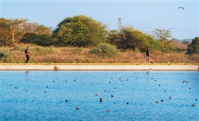 在肯尼亚内罗毕,中国企业为当地量身定制污水处理方案,中企修复扩建的内罗毕丹多拉污水处理厂成为多种鸟类的重要栖息地和公众环保教育的重要场所。图为当地居民经过丹多拉污水处理厂。 |